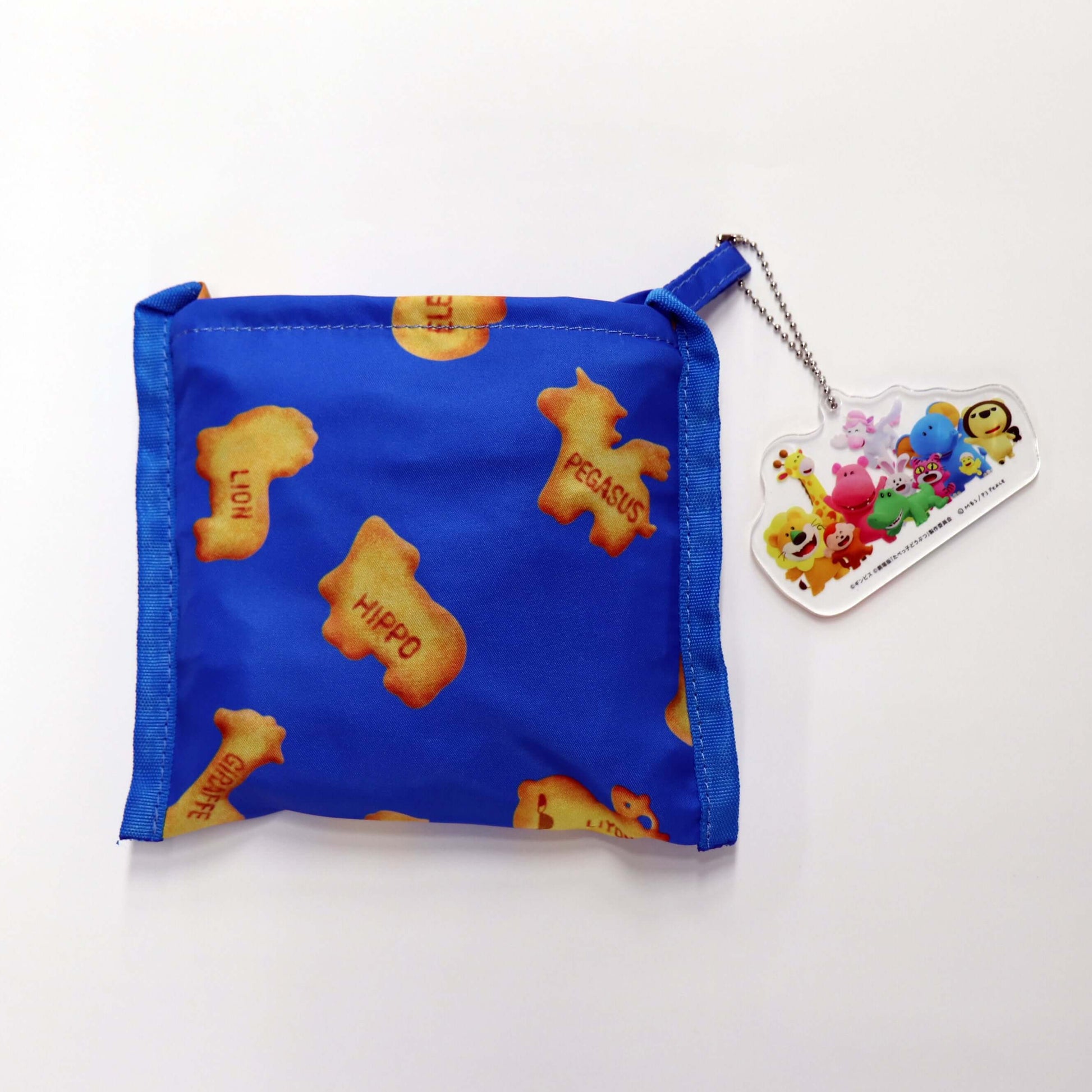 映画「たべっ子どうぶつ THE MOVIE」と大阪・毎日放送のキャラクター「らいよんチャン」がコラボしたポケットイントート。サイズも大き目でたっぷりはいります。ビスケットにらいよんチャンのフォルムも付け加えました!アクリルチャームもついています。